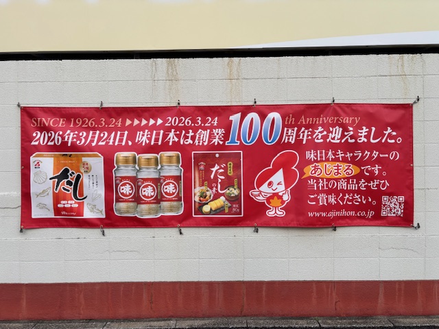 お知らせ 2026年3月25日 看板変更 2026年3月24日に100周年を迎え、屋外の看板と横断幕を変更しました。当社のイメージキャラクター『あじまる』が新登場!これからも宜しくお願い致します。 お知らせ一覧に戻る